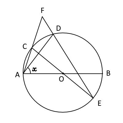 図で、点$O$は、線分$AB$を直径とする円の中心であり、3点$C,D,E$は円$O$の円周上にある点である。